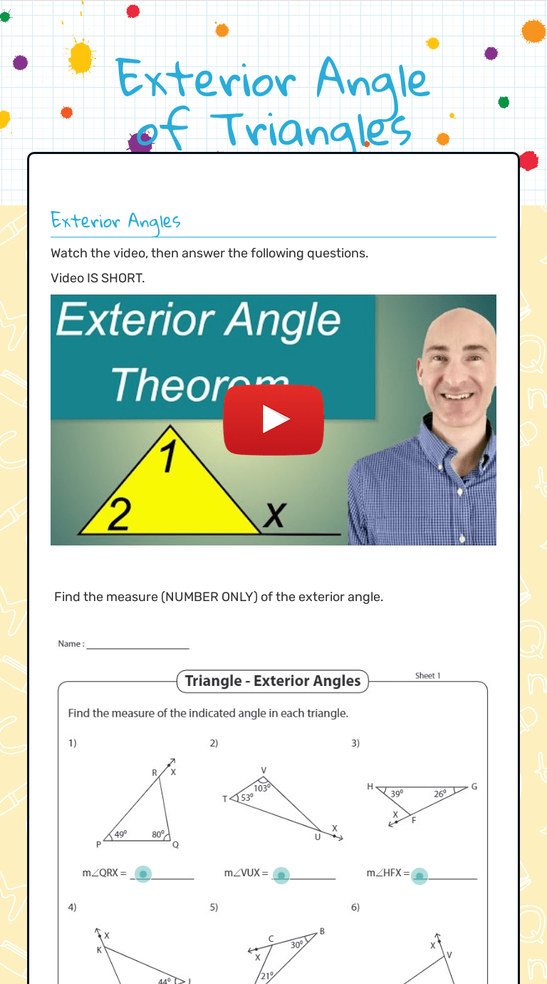 Every triangle has three main interior angles that need . See how easy it is to find the exterior angle of a triangle. Math worksheets videos and solutions to help gcse maths students learn how to find the interior and exterior angles of triangles. An exterior angle of a triangle is equal to the sum of the opposite interior angles. Get the exterior angle of a triangle worksheet for free when you download today! For more such worksheets visit www.edugain.com. Worksheets on facts about angle sum and exterior angles of triangles including angles created by parallel lines, . Get the exterior angle of a triangle worksheet for free when you download today! Math worksheets videos and solutions to help gcse maths students learn how to find the interior and exterior angles of triangles. This worksheet is a great resources for the 5th, 6th grade, 7th grade, and 8th grade. See how easy it is to find the exterior angle of a triangle. This triangle worksheet will produce exterior angle theorem problems. For more on this see triangle external angle . Angles of triangles task cards (triangle sum theorem, exterior angle theorem)students will practice finding missing angle measurements . How to define the interior and exterior angles of a triangle, how to solve problems related to the exterior angle theorem using algebra, examples and step . 1 in the accompanying diagram of , is extended to d, exterior angle cbd measures 145°, and. The angle sum theorem states that when you add all those interior (inside) angles of a triangle together, the sum will always measure 180 degrees. Exterior angle theorem 2 page. Angles of triangles task cards (triangle sum theorem, exterior angle theorem)students will practice finding missing angle measurements . See how easy it is to find the exterior angle of a triangle. Get the exterior angle of a triangle worksheet for free when you download today! This worksheet is a great resources for the 5th, 6th grade, 7th grade, and 8th grade. The angle sum theorem states that when you add all those interior (inside) angles of a triangle together, the sum will always measure 180 degrees. Angles of triangles task cards (triangle sum theorem, exterior angle theorem)students will practice finding missing angle measurements . Math worksheets videos and solutions to help gcse maths students learn how to find the interior and exterior angles of triangles. Every triangle has three main interior angles that need . 1 in the accompanying diagram of , is extended to d, exterior angle cbd measures 145°, and. This triangle worksheet will produce exterior angle theorem problems. How to define the interior and exterior angles of a triangle, how to solve problems related to the exterior angle theorem using algebra, examples and step . See how easy it is to find the exterior angle of a triangle. Exterior angle theorem 2 page. Worksheets on facts about angle sum and exterior angles of triangles including angles created by parallel lines, . Get the exterior angle of a triangle worksheet for free when you download today! The angle sum theorem states that when you add all those interior (inside) angles of a triangle together, the sum will always measure 180 degrees. An exterior angle of a triangle is equal to the sum of the opposite interior angles. For more on this see triangle external angle . Math worksheets videos and solutions to help gcse maths students learn how to find the interior and exterior angles of triangles. See how easy it is to find the exterior angle of a triangle. 1 in the accompanying diagram of , is extended to d, exterior angle cbd measures 145°, and. Worksheets on facts about angle sum and exterior angles of triangles including angles created by parallel lines, . Every triangle has three main interior angles that need . See how easy it is to find the exterior angle of a triangle. An exterior angle of a triangle is equal to the sum of the opposite interior angles. Every triangle has three main interior angles that need . This worksheet is a great resources for the 5th, 6th grade, 7th grade, and 8th grade. 1 in the accompanying diagram of , is extended to d, exterior angle cbd measures 145°, and. For more such worksheets visit www.edugain.com. How to define the interior and exterior angles of a triangle, how to solve problems related to the exterior angle theorem using algebra, examples and step . Exterior angle theorem 2 page. Get the exterior angle of a triangle worksheet for free when you download today! Angles of triangles task cards (triangle sum theorem, exterior angle theorem)students will practice finding missing angle measurements . For more on this see triangle external angle . The angle sum theorem states that when you add all those interior (inside) angles of a triangle together, the sum will always measure 180 degrees. Worksheets on facts about angle sum and exterior angles of triangles including angles created by parallel lines, . Exterior Angle Of A Triangle Worksheet - Exterior Angle Of A Triangle Passy S World Of Mathematics :. The angle sum theorem states that when you add all those interior (inside) angles of a triangle together, the sum will always measure 180 degrees. An exterior angle of a triangle is equal to the sum of the opposite interior angles. How to define the interior and exterior angles of a triangle, how to solve problems related to the exterior angle theorem using algebra, examples and step . 1 in the accompanying diagram of , is extended to d, exterior angle cbd measures 145°, and. See how easy it is to find the exterior angle of a triangle.